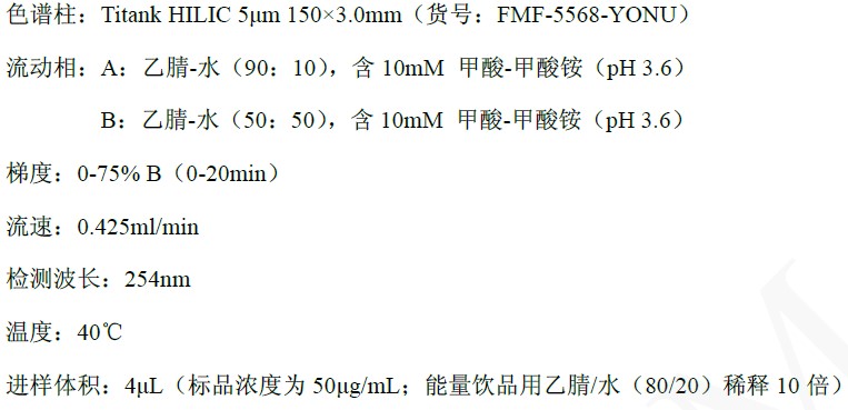 國(guó)標(biāo)中用的UPLC的酰胺基柱(1.7u,150*3.0mm)或者HPLC的Si 60硅膠柱(5u,250*4.6mm),以適配不同實(shí)驗(yàn)室的儀器條件。