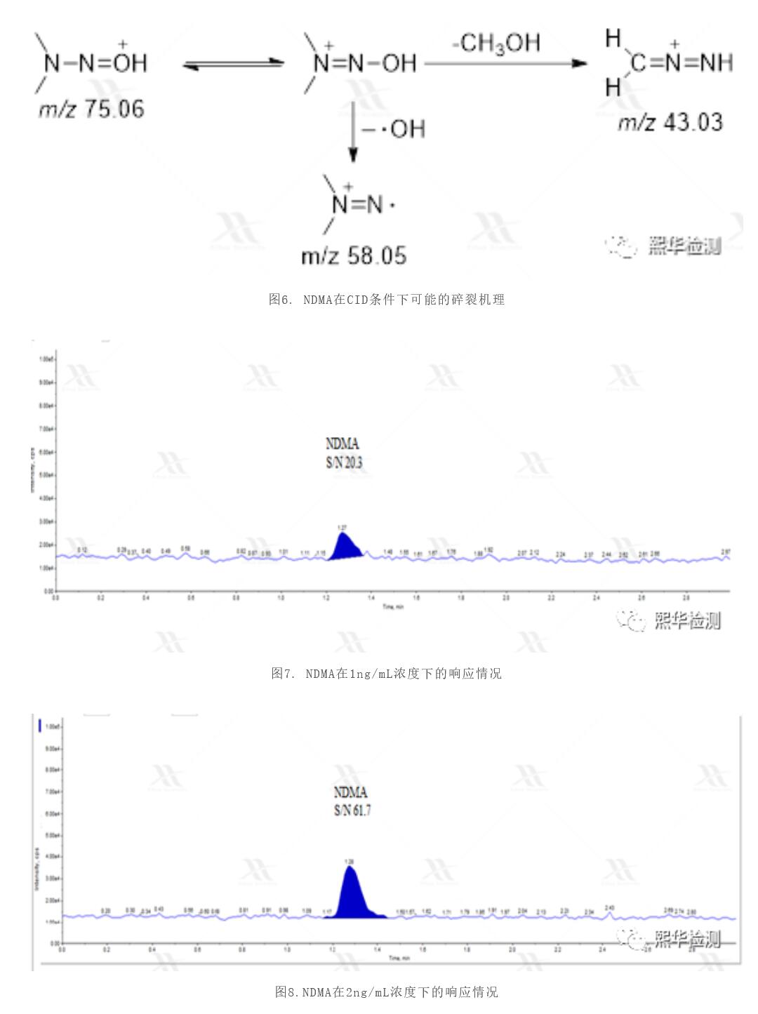 為了考察三重四極桿質(zhì)譜對NDMA的檢測能力,我們從幾臺API 6500plus液質(zhì)系統(tǒng)(市面上靈敏度和穩(wěn)定性最突出的三重四級桿質(zhì)譜)中隨機選擇了一臺并開展了試驗(圖5)。通過條件摸索,可知NDMA質(zhì)子加合物在常規(guī)CID(碰撞誘導解離)條件下,主要碎裂為m/z 43和m/z 58兩種碎片離子,推測其可能通過丟失甲醇分子以及羥基自由基【3】得到上述碎片(圖6)。鑒于該原理,我們使用m/z 43為定量離子,m/z 58作為定性離子。如圖7所示,使用FDA官方公布的液相條件,1ng/mL下NDMA對照品的信噪比為20.3,2ng/mL時為61.7,六針峰面積的RSD為2.5%。在有雷尼替丁及其制劑加標的情況下,回收率在90%以上,結(jié)果令人滿意。但另一方面,我們發(fā)現(xiàn)該方法的基線噪音異常地高。這也比較容易理解,因為NDMA質(zhì)子化后,質(zhì)荷比只有75,非常容易受到空氣、溶劑以及緩沖鹽體系中小分子雜質(zhì)的干擾,導致噪音較大。