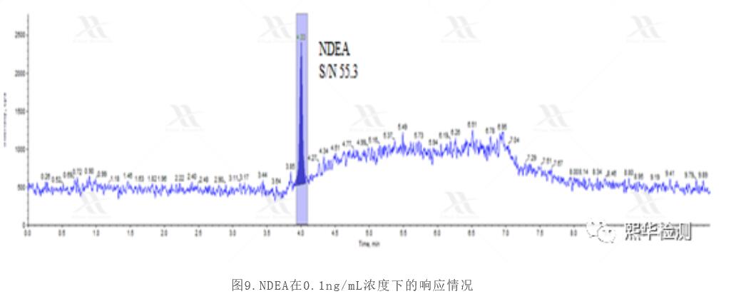 如上所述,三重四極桿質(zhì)譜對NDMA的檢測能力令人滿意,我們相信類似的方法對于NDEA的檢測效果會更佳。因為NDEA的分子量為102,受低分子量區(qū)雜質(zhì)的干擾更小,理論上應該有更好的靈敏度。如圖9所示,在0.1ng/mL濃度下,NDEA的信噪比達到55,證實了上述推測。