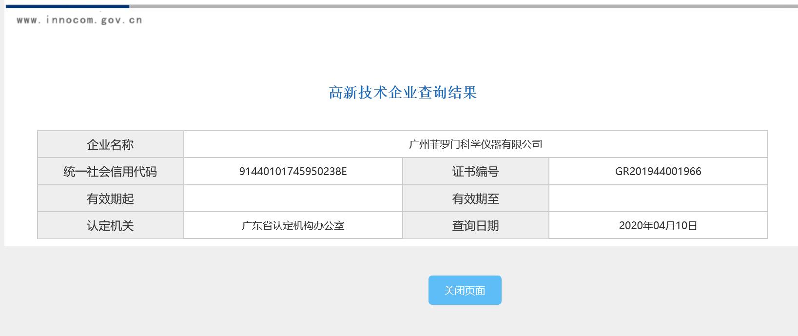 根據國家《高新技術企業(yè)認定管理辦法》和《高新技術企業(yè)認定管理工作指引》的相關規(guī)定,廣州菲羅門科學儀器有限公司被認定為國家級高新技術企業(yè)。 菲羅門高新企業(yè)證書編號:GR201944001966