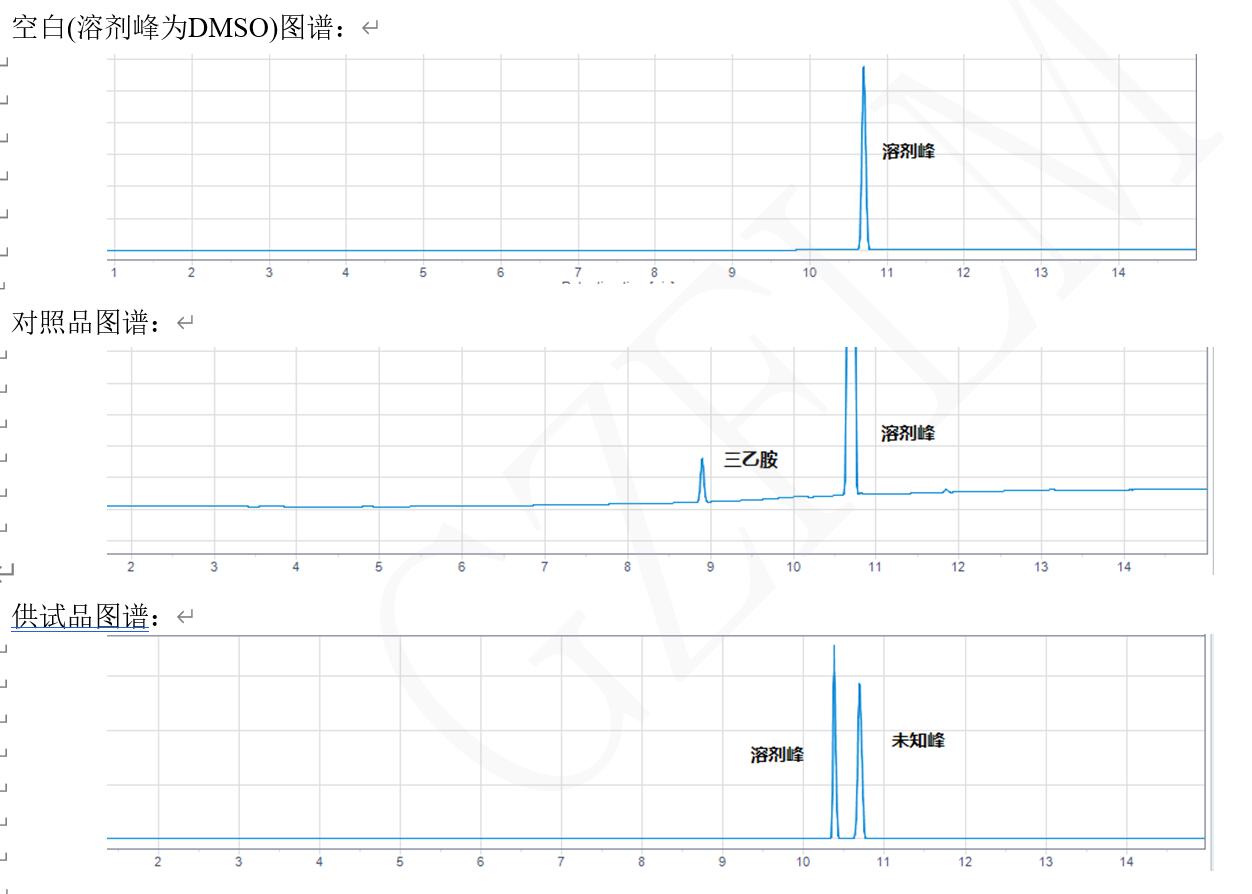評價:此款氣相柱,在本樣品溶劑殘留測試中,對溶劑峰 DMSO,以及TEA 峰,均有很好優(yōu)于其它柱的峰形。且在供試品分析中,溶劑峰與未知峰完全分離,峰形優(yōu)秀。