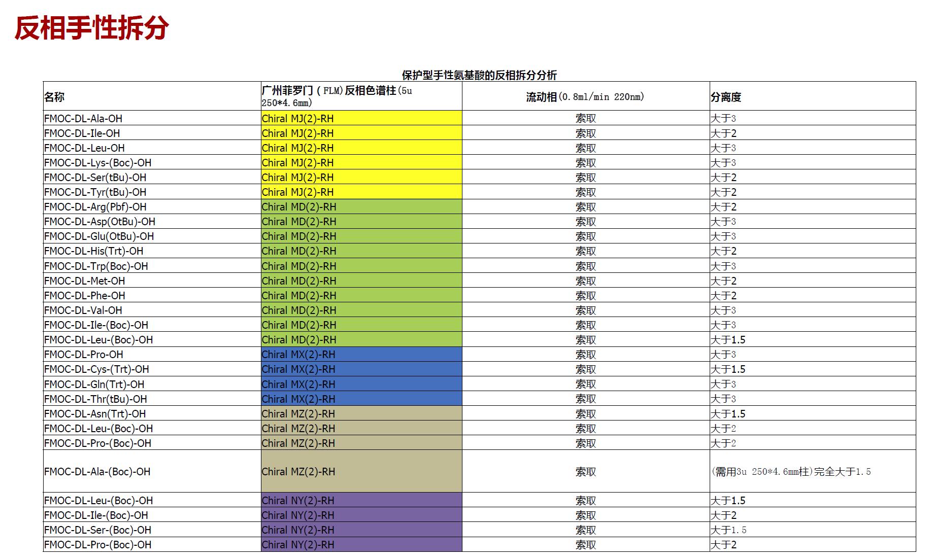 保護型的各類氨基酸,全部可以在某種多糖型手性柱中實現(xiàn)手性拆分。推薦的一套
