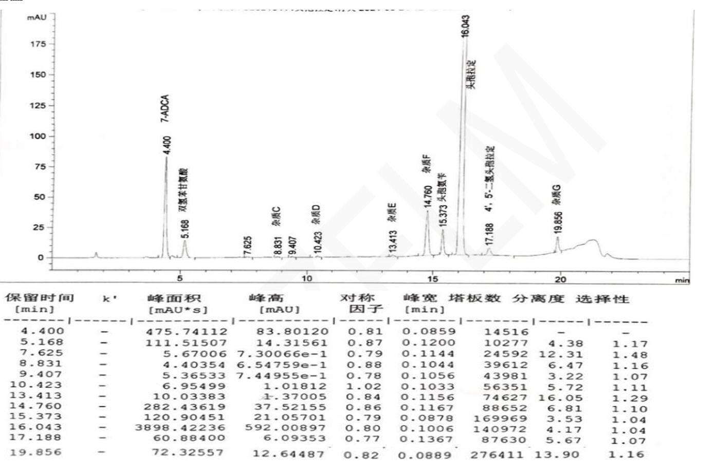 客戶評(píng)價(jià):頭孢拉定的保留時(shí)間約為 15min,7-氨基去乙酰氧基頭孢烷酸、雙氫苯甘氨酸、雜質(zhì) C、雜質(zhì) D、雜質(zhì) E、雜質(zhì) F、頭孢氨芐、4',5'-二氫頭孢拉定和雜質(zhì) G 依次出峰,頭孢拉定和頭孢氨芐的分離度應(yīng)不 小于 4. 0,其他各組分峰間分離度符合規(guī)定。