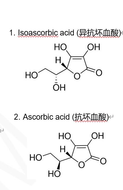 抗壞血酸與異抗壞血酸是一對光學異構體??箟难崾且环N營養強化劑,藥用為多。異抗壞血酸,多用于食品與化妝品中,作為防腐劑用。