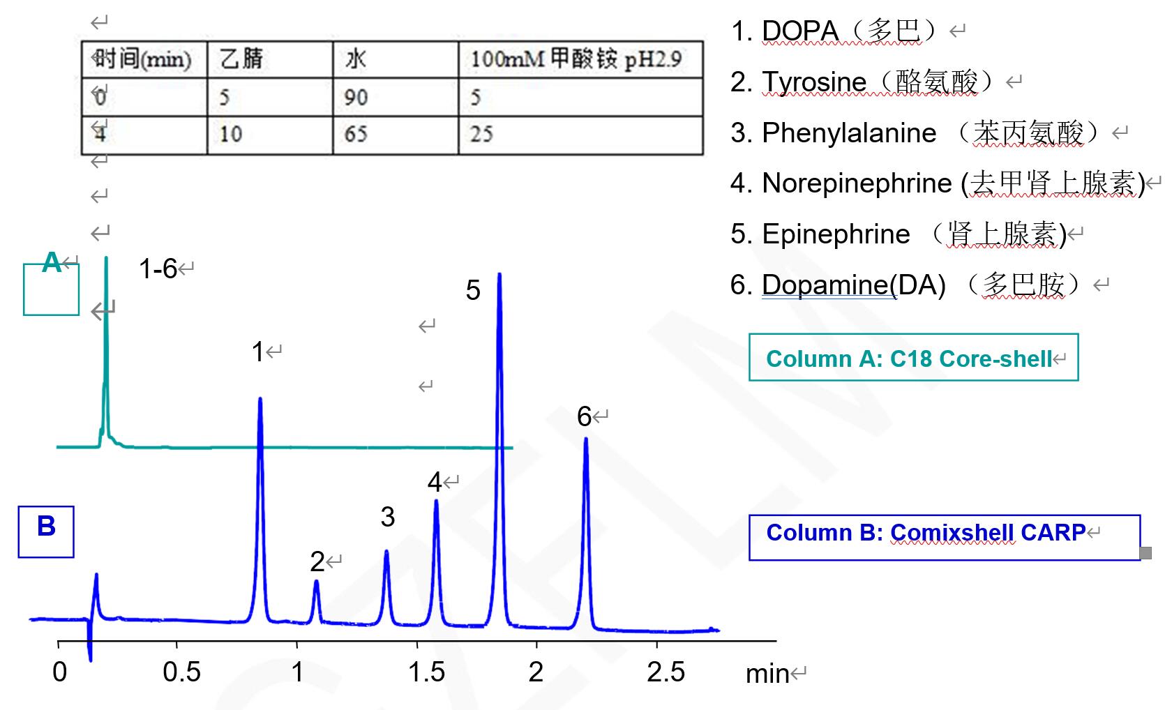 說(shuō)明:多巴胺等大極性神經(jīng)遞質(zhì)在C18上沒(méi)有保留難以分離,采用Comixshell陽(yáng)離子交換