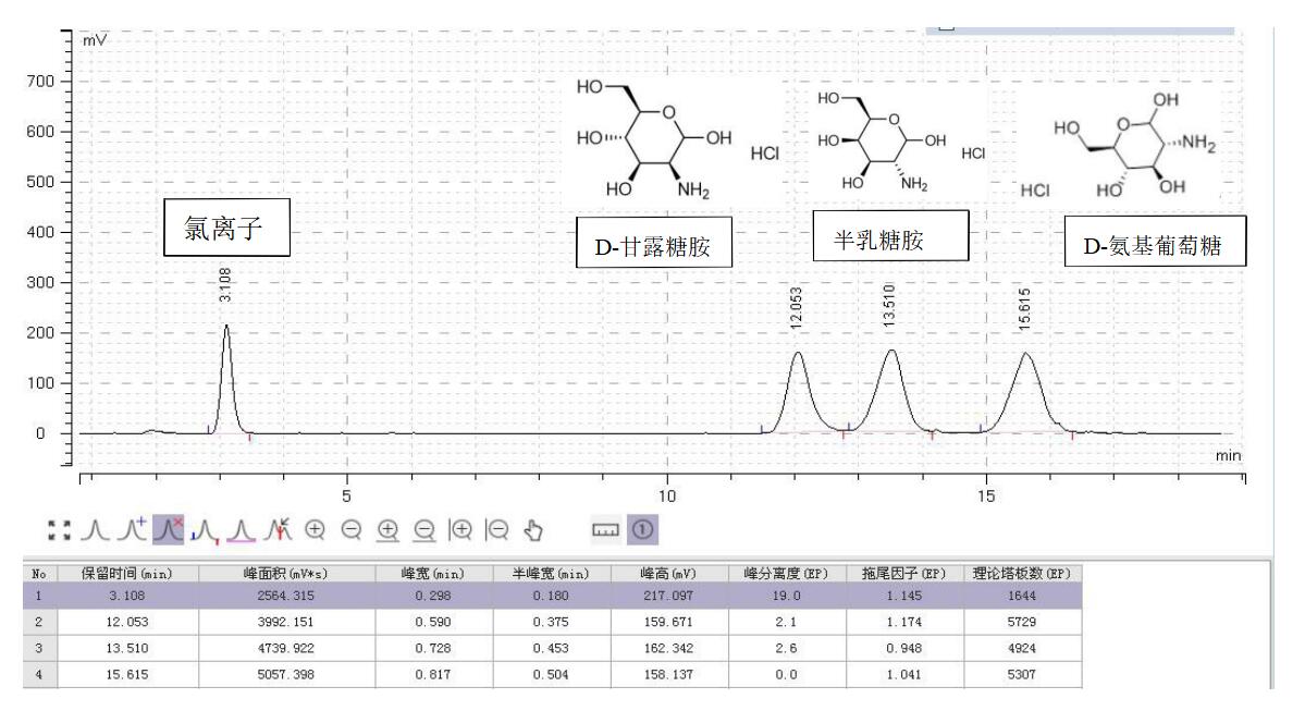 方法說明:半乳糖胺鹽酸鹽、甘露糖胺鹽酸鹽、氨基葡萄糖鹽酸鹽,三者屬于同分異構體的氨基糖,用Comixsil HCS 陽離子交換+HILIC 混合模式,在上述條件下可以達到分離目的。