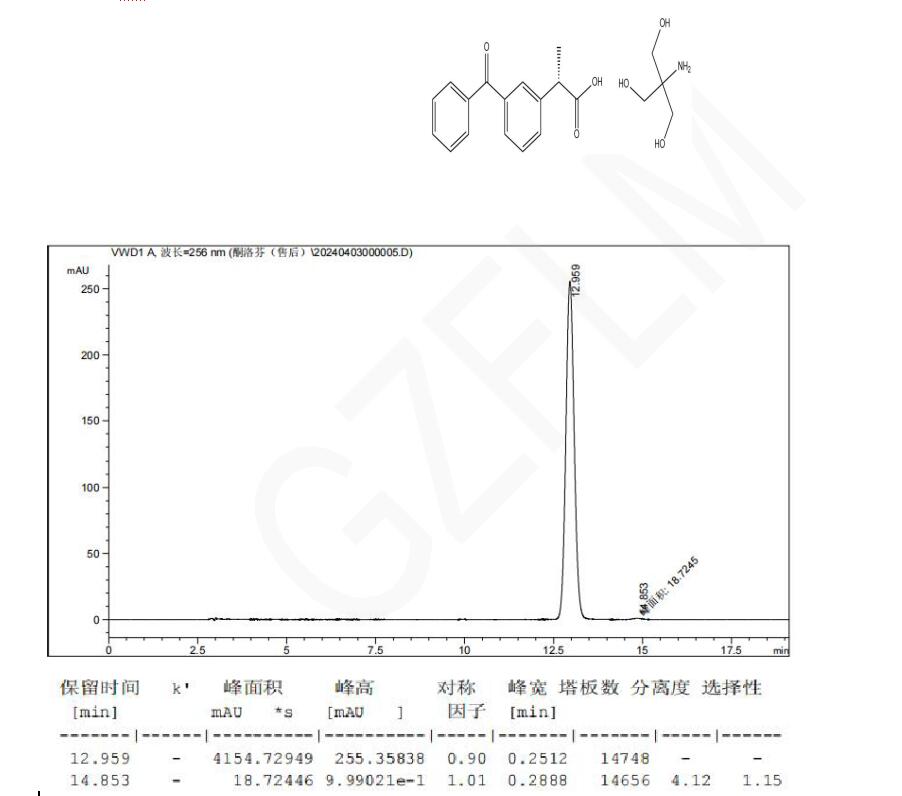 App ID: FLM-B240003 右旋酮洛芬氨丁三醇手性拆分 色譜柱:Chiral NQ(2)-RH 5μ 250*4.6mm 貨號(hào):FMG-AC5-A06-R 流動(dòng)相:反相 (詳詢銷售代表) 流速:1 mL/min 檢測(cè)波長:256nm 柱溫:25℃ 樣品濃度:1mg/mL,純水溶解 進(jìn)樣量:2ul ![]() |