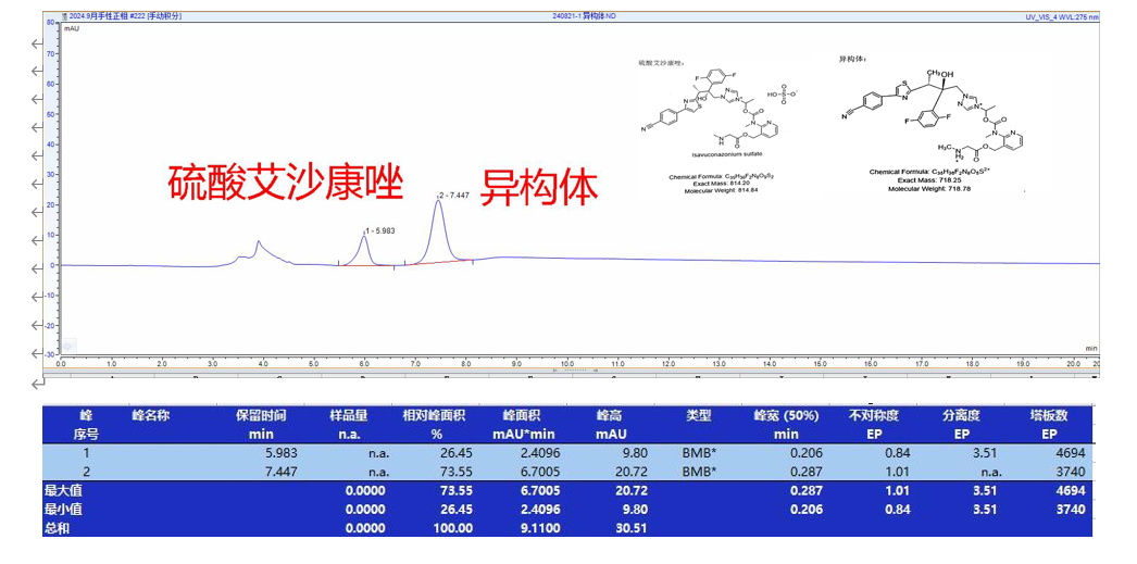 App ID: FLM-B240015 硫酸艾沙康唑及其對(duì)映異構(gòu)體的手性拆分 色譜柱:Chiral ND(2) 5u 250*4.6mm (P/N: FMG-AC5-A01-NFC) 流動(dòng)相:正相(咨詢) 柱溫:25℃ 流速:0.8 mL/min 檢測(cè)波長(zhǎng):275nm 濃度:N/A 溶劑:30%乙腈 圖譜 1: