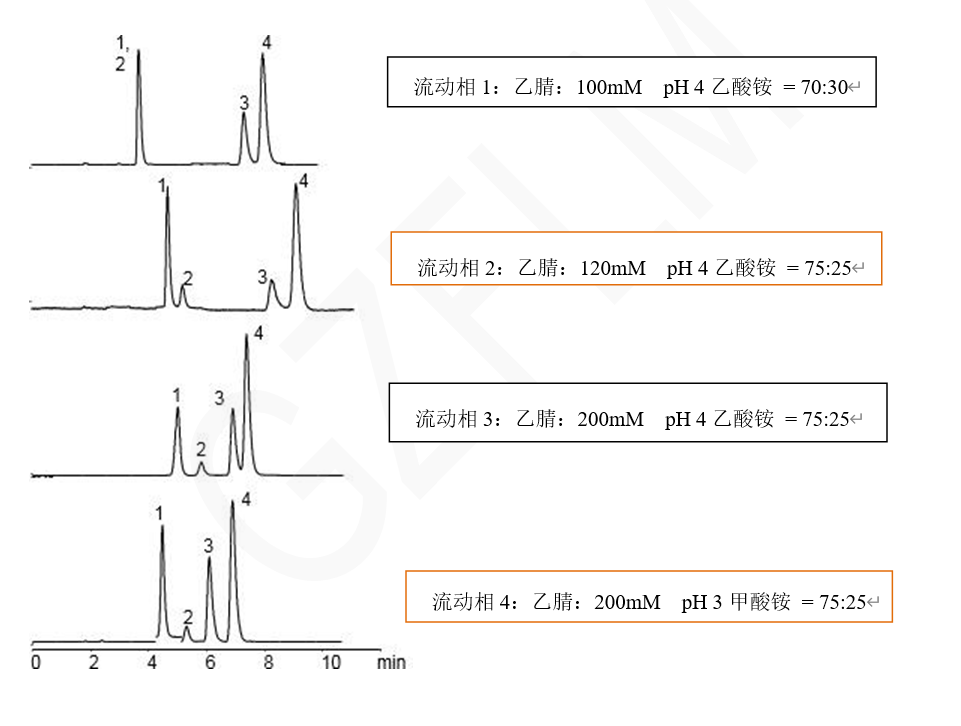 說(shuō)明:本案例中乙腈比例及緩沖鹽種類和強(qiáng)度的變化帶來(lái)磷霉素與庶糖的0分離到完全分離的變化, 以及保留時(shí)間上的變化。類似的雜質(zhì)也可通過(guò)此類調(diào)整或者梯度調(diào)整條件,實(shí)現(xiàn)分離。 在液相中同時(shí)分析磷霉素、蔗糖、氨丁三醇及鈉離子是一個(gè)復(fù)雜的過(guò)程,因?yàn)檫@四種物質(zhì)在化學(xué)性質(zhì)、極性和保留行為上可能存在顯著差異。以下是一種可能的分析策略: