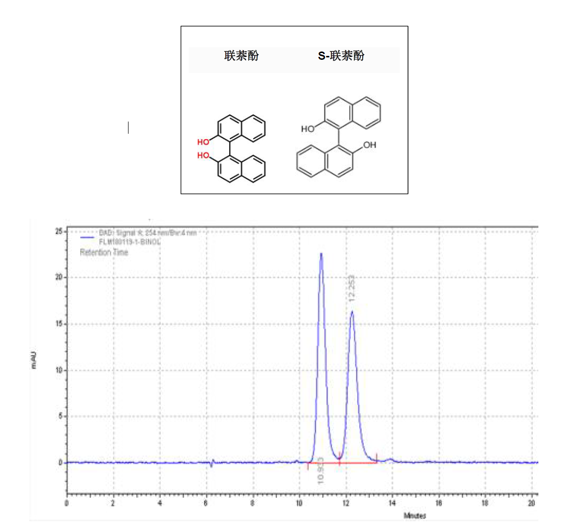 App ID: FLM-B250006 聯(lián)萘酚與S-聯(lián)萘酚的分離 色譜柱:Chiral INC 250*4.6mm,5um (貨號(hào):FMG-JY5-I03) 流速:0.5 mL/min 檢測(cè):波長(zhǎng)254nm, 柱溫:25°C 樣品濃度:N/A 進(jìn)樣量:1μ 溶劑:水:甲醇=40:60(V:V) 流動(dòng)相:咨詢(xún)銷(xiāo)售