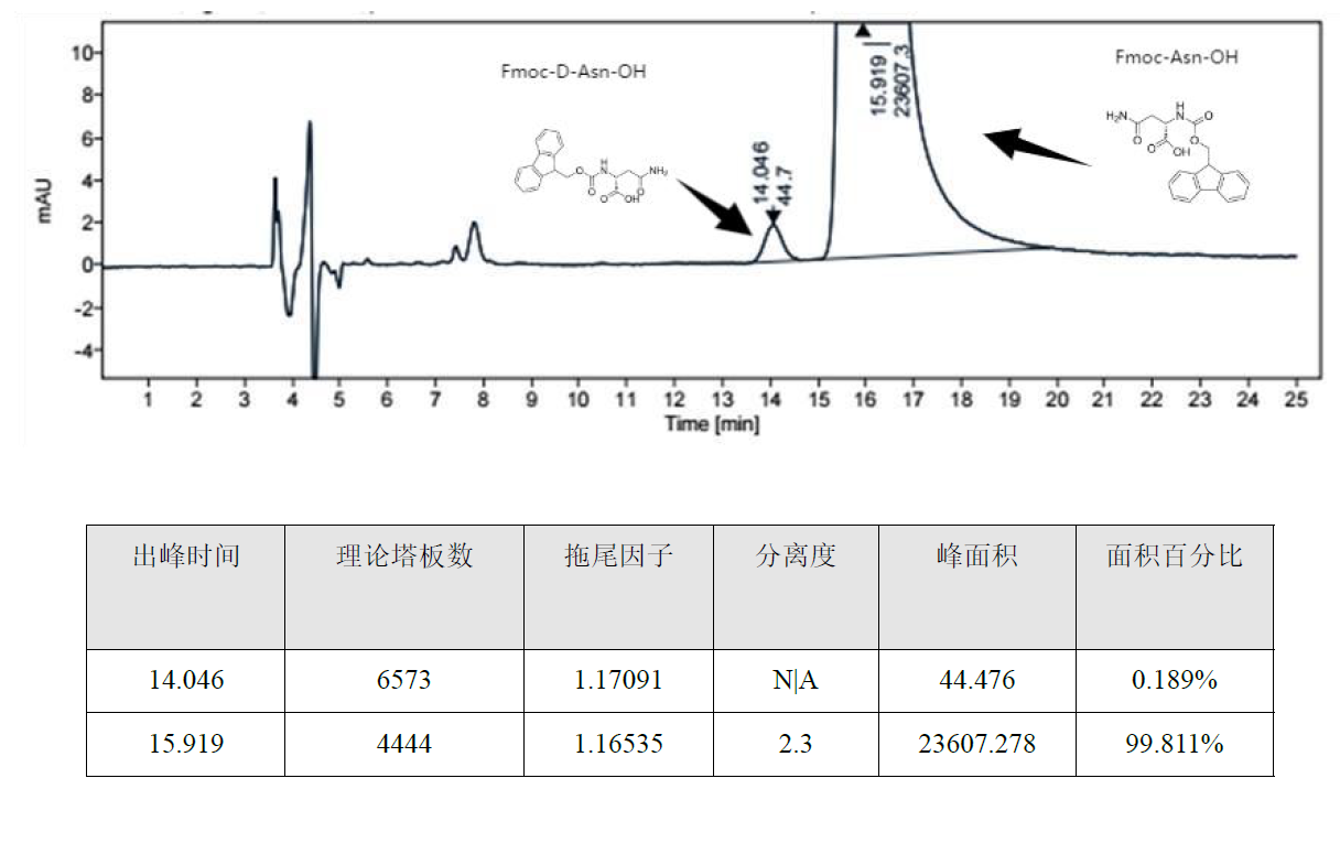 App ID: FLM-B250007 Fmoc-L-天冬酰胺與Fmoc-D-天冬酰胺的手性分離 色譜柱:Chiral NQ(2)4.6*250mm,5um (貨號:FMG-AC5-A06-NFC) 流速:0.8 mL/min 檢測:UV,254nm 柱溫:35°C 樣品濃度:N/A 進樣量:1μ 流動相:咨詢銷售 色譜圖: ![]() |
