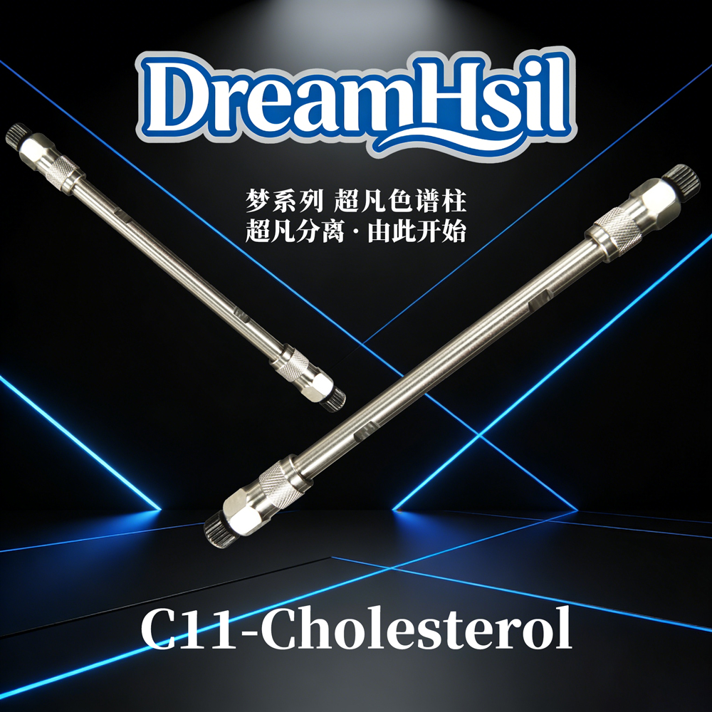 - DreamHsil C11-Cholesterol 色譜柱 C11-Cholesterol具有非常獨特的選擇性。采用獨特鍵合技術,將固定相直接獨立的單點鍵合于Si-H鍵上直接形成Si-C鍵的C11-Cholesterol鍵合相。