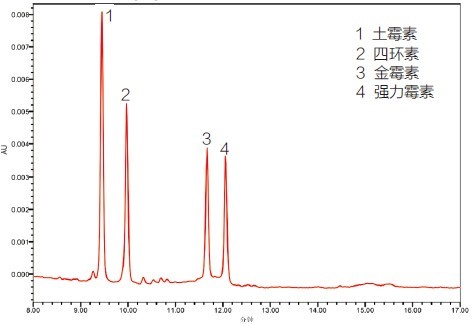 2、添加水平為0.8mg/kg牛奶基質(zhì)中四環(huán)素檢測(cè)色譜圖