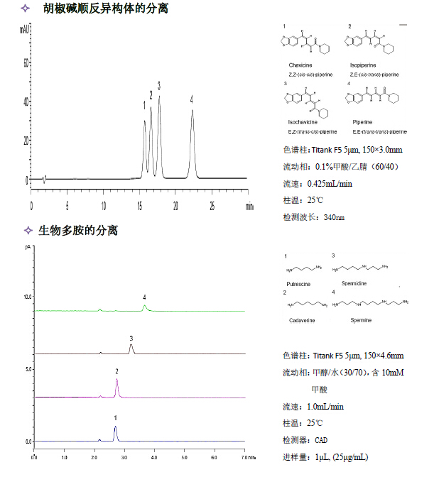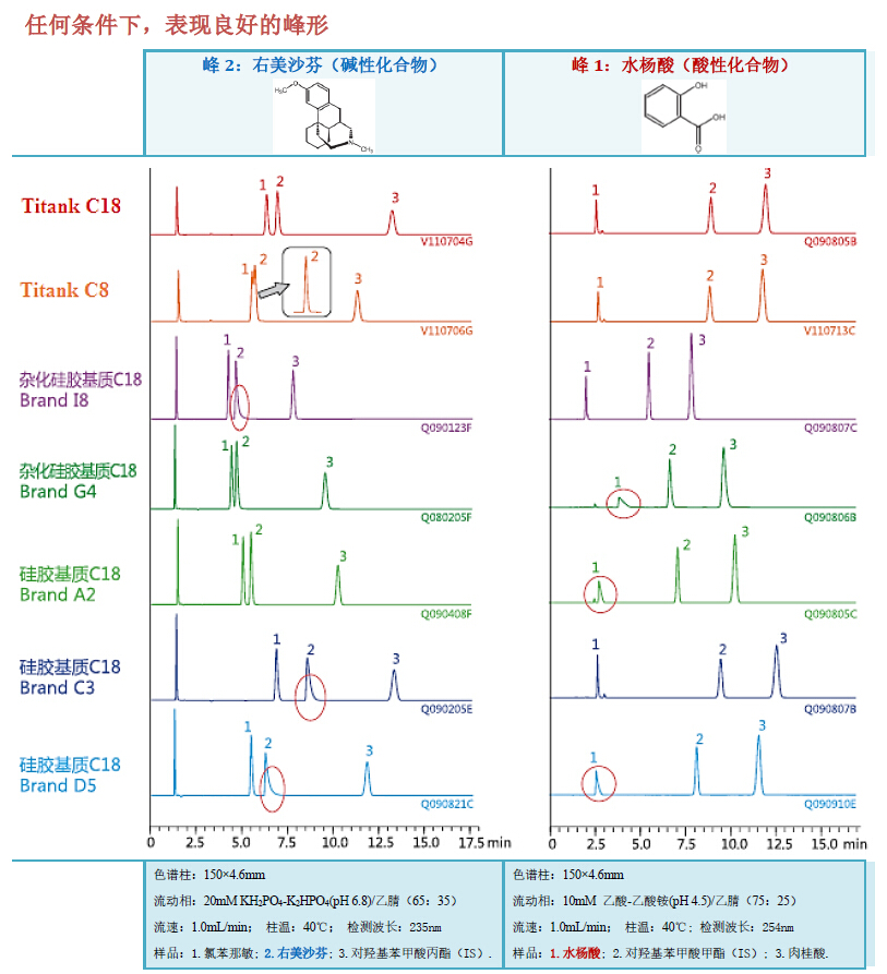 上圖顯示,對(duì)易于引起吸附、拖尾及易產(chǎn)生再現(xiàn)性問(wèn)題的堿性化合物和配位化合物,Titank 系列能獲得穩(wěn)定的重現(xiàn)性。